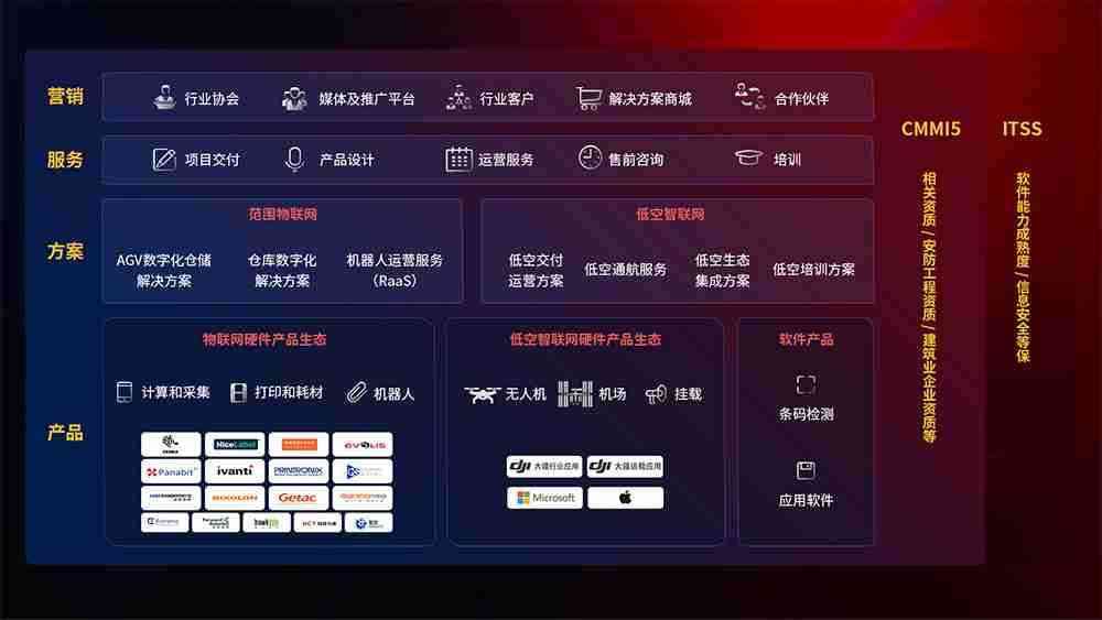 聚合国内外先进的物联网硬件产品品牌,,,聚焦数字化仓储、、机器人运营、、低空智联网等领域,,,,共同打造适合客户业务场景的解决方案并提供交付服务